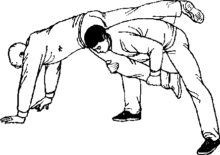 3 .上体向右下倾,右肩向下压乙右大腿(图457)。可 把乙压摔向后倒地。