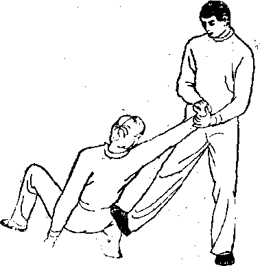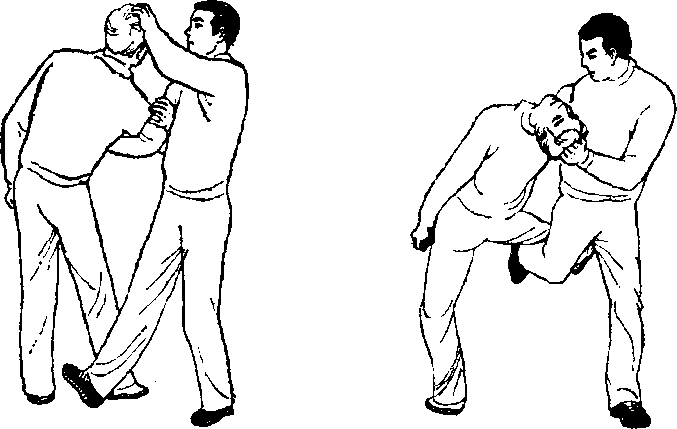 3,右腿向后上撩乙右腿左手向下扒其头(图569)可把乙撩扒倒地