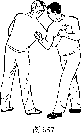 1 左手扣压住乙右手腕(图566)上体左转右臂屈肘下压乙右臂(图567)