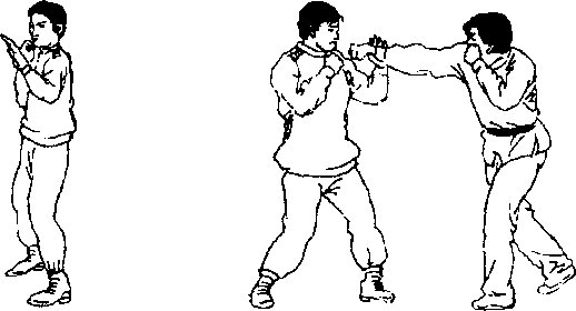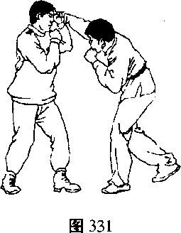实战姿势开始。左手(右手)屈臂向头部挡防(图330)。