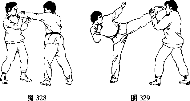 3对手左边腿攻击我头部我以左掌拍挡防守(图329)。