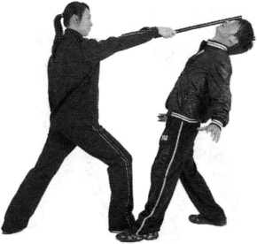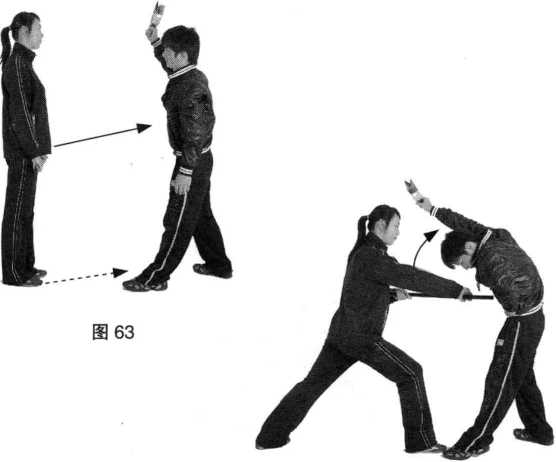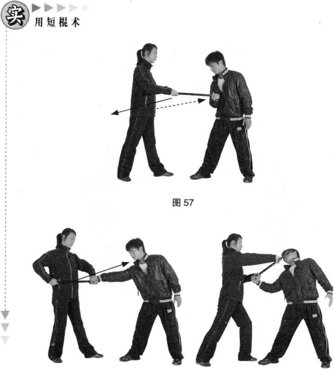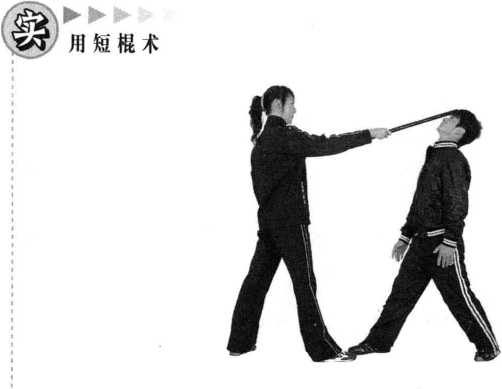 我正面站立对歹徒,双手持棍垂于体前,歹徒双手持械由 上向下劈击我头部,我迅速弓身前伏,右脚向前一大步,双手 持棍向前(右手在前)顶击歹徒腹部。当歹徒被我击中腹部, 弓身后退,低头护痛时或者为躲避我攻击而采用收腹后退时, 我立即左手松棍,右手持棍向外翻腕,用棍梢部由上向前点击 歹徒面部。(图63_图65)