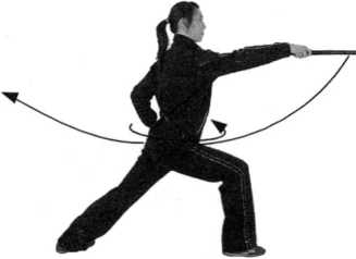(2) 身体重心前移,右脚向前上一大步成右弓步,随身体
