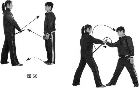 我右手持棍由左向右平扫时,被歹徒右手抓住手腕,我右 臂下沉,前臂外旋手腕外翻,用棍末端别压歹徒手腕,迫使歹 徒松手,继而用棍梢端点击歹徒面部。(图66—图68)