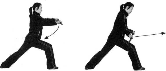(3) 身体左转,右脚尖内扣,两腿膝关节弯曲半蹲成马 步;右手松棍握拳,手心向内,屈肘于胸前,然后右拳拳眼向 上由胸前向右侧弹击;左手持棍,手心向内、棍头朝后下收于 腰间;目视右前方。(图152)