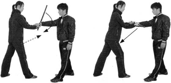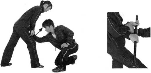 (2)身体稍右转,左手从右臂下伸出,手心向下抓握住棍 子,两手用力下压并回收。(图150、图151)
