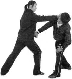 套路说明及实用方法?言;这是一个典型的擒拿动作。我右手持棍击歹徒时,被歹徒 右手抓住手腕,我右手用力屈肘回收,同时手臂外旋,右手棍 横压在歹徒握我的手腕之上,我左手由右手前臂下穿出,握住 棍子靠近歹徒手腕的部位,两手用力下压并稍左转体,将歹徒 握我手腕之手扣压在我右手臂和棍子之间(图153—图155附 图)。如遇歹徒较多,为防止受到其他歹徒的攻击,我两手用 力压别歹徒手腕后,右手放开棍子握拳收于胸前,而后用拳背 弹击歹徒面部。(图156)