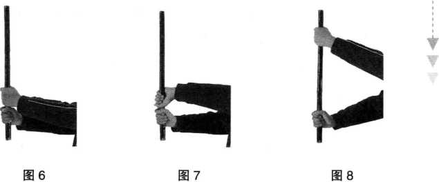(4) 开手正反握法:双手分开握于棍的两端,虎口均朝向 棍中,小指所对应方向留2厘米的空隙。(图9)