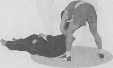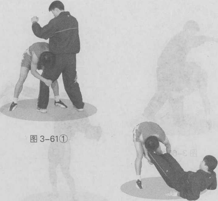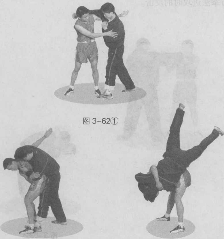 动作方法双方抱缠时我迅速向左闪身右臂由对方腋下穿过同时右腿向右插步与左脚平行两腿屈蹲右手抓住对方左手臂随即向下弓腰两腿迅速蹬直将对方背起后向前摔出(图3-62)。