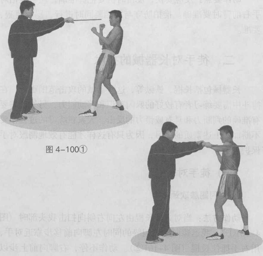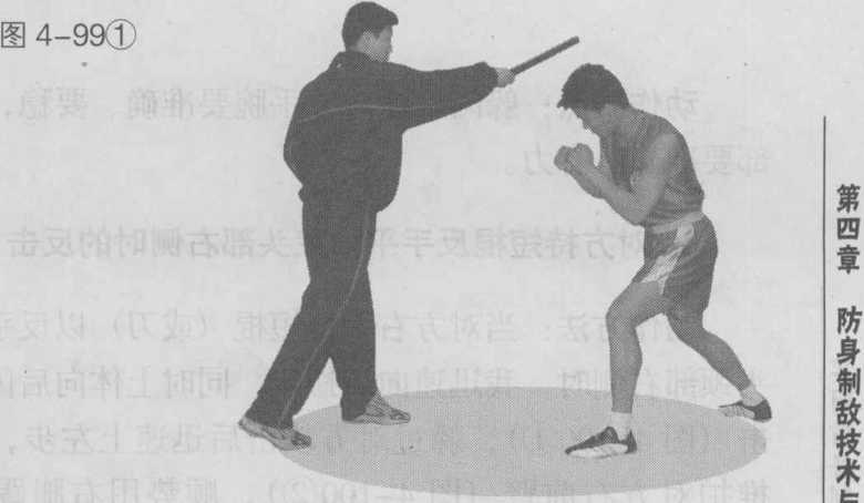 动作方法当对方右手持短棍(或刀)以反手平扫袭击我头颈部右侧时我迅速向后撤步同时上体向后闪躲对方的攻击(图4-1001)躲过对方攻击后迅速上左步用左手向外推拍对方右前臂(图4-1002)顺势用右腿踢击对方裆部(图4-100)