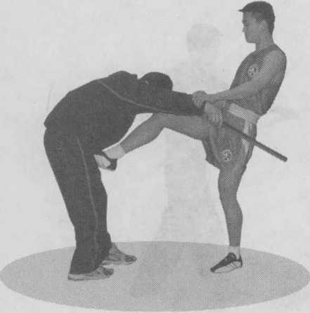 动作方法当对方持短棍横击我头部时(图4-991)我迅速低头躲闪对方的攻击(图4-992)用右手抓住对方右手腕(图4-993),左手抓住对方头部向下用力按压以右腿冲膝攻击对方裆部(图4-99)
