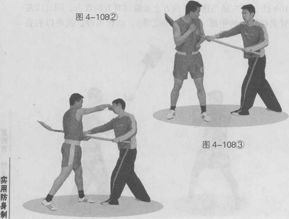 动作方法当对方持铁锹由右向左扫击我头部时(图4-108),我左腿迅速向右前方上步躲过对方的攻击同时以左臂夹住铁锹的中部(图4-108)动作不停我再以右直