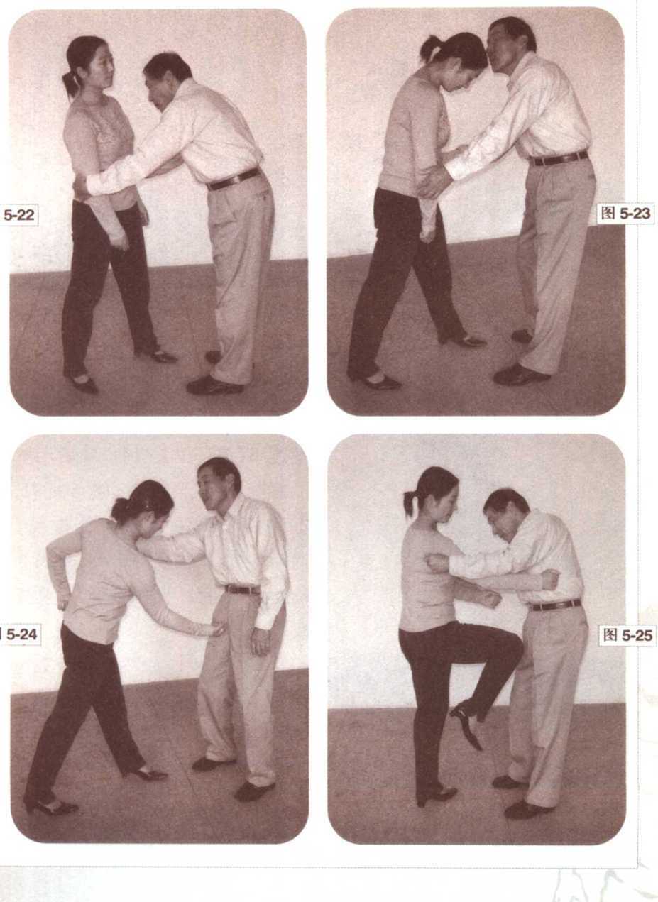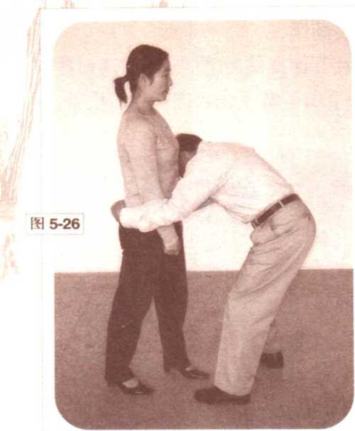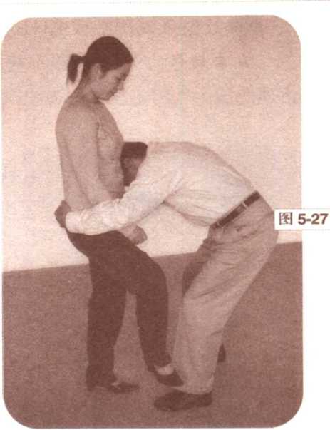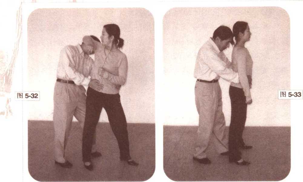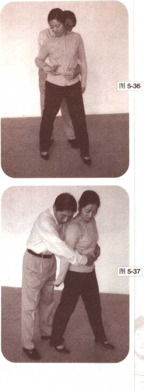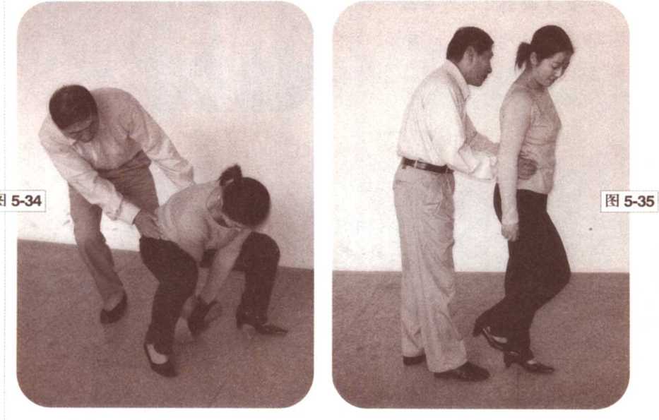 女岳勃作2当歹徒两脚前后站立并从身后紧抱腰部时(图5-33),两腿屈膝下蹲上体前