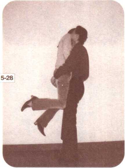 反击翎作2在歹徒紧抱的情况下(图5-26),稍提膝后用脚后跟猛击歹徒的脚趾(图5-27)。亦可两膝弯曲让歹徒抱着,以消耗其体力(图5-28),待到歹徒抱不动时两脚着地再找反击的机会。