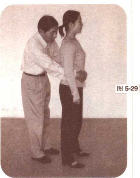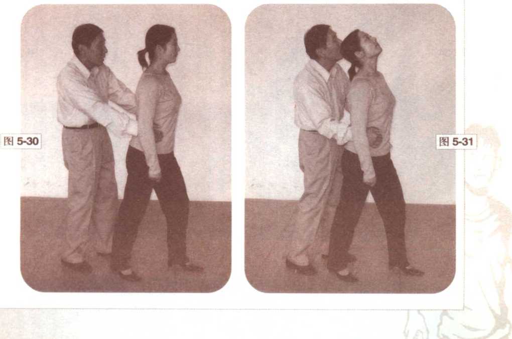 友击初作当被歹徒从背面抱住腰时(图5-29),左脚(或右脚)假装向前进一步作挣脱状的假动作(图5-30),使歹徒用力拉
