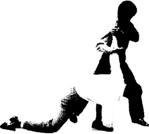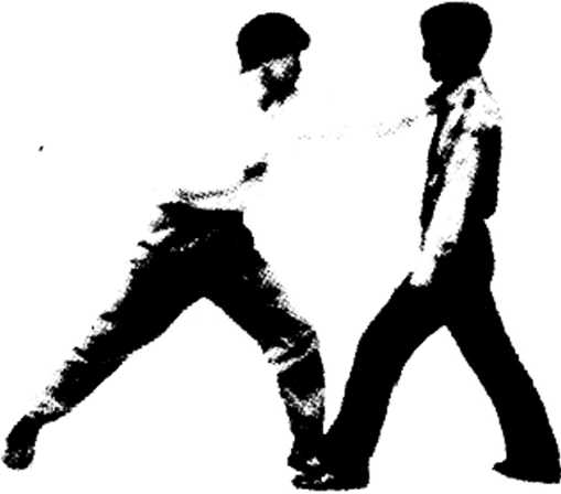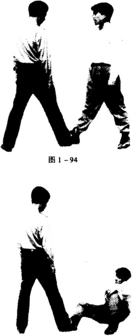 动作在技击过程中看到对方右脚在前两脚出现空隙有机可乘时我迅速以右脚前伸用脚掌踩住对方右脚内踝部位以右脚跟为支点屈右膝用力下踩对方由于内踝被踩,疼痛难忍失去平衡而摔倒。(图1-94、95)