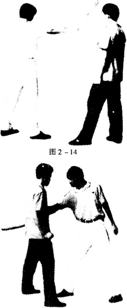 力回拉同时用右肘顶击其胸部使其疼痛难忍丧失抵抗能力。(图2—14、15、16)