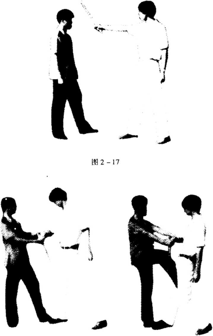 动作当对方右手持短棍劈击我头部时我迅速用右前臂上架顺势抓住其右手腕部左手配合右手动作抓紧其右前臂两手用力回折使其右手腕关节小于90。同时起右腿猛踢其档部而制服他。(图2—17、18、19)
