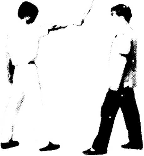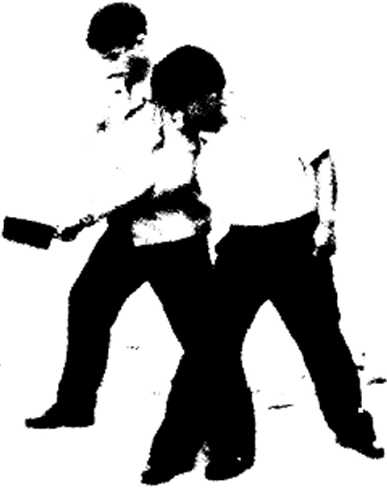 动作对方右手握菜刀由上向下向我劈来时,我立即向左闪身上左步同时左手顺势由上向下抓住其右手腕处左肘迅速上抬,用力夹住其右臂左脚后插吃住其右脚使其难以转动右手由外侧抓住其腕关节两手合力旋拧使其被拿住。(图2—24、25)