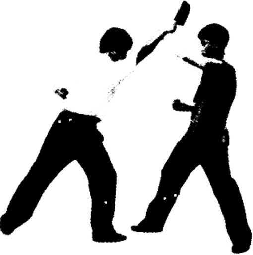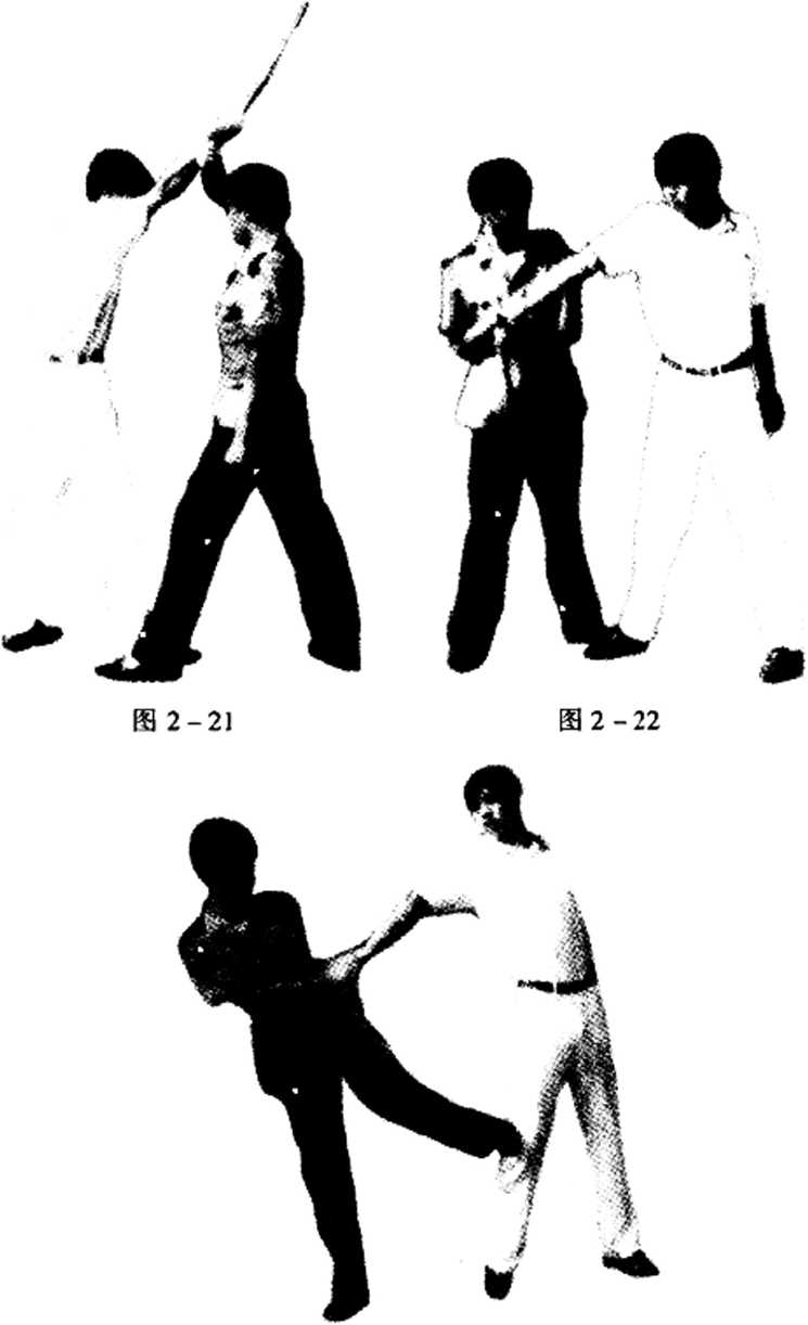 动作对方右手持短棍由上向下击来时我迅速向左闪身躲过棍击顺势抬右臂上架并掳、抓住其右手腕用力旋拧并向下压同时左手托握住其右肘向上抬起左脚横踏其右膝外侧使其失去抵抗能力被擒住。(图2—20、21、22、23)