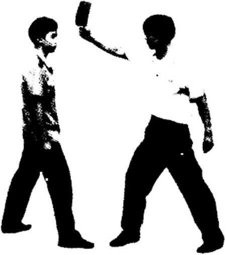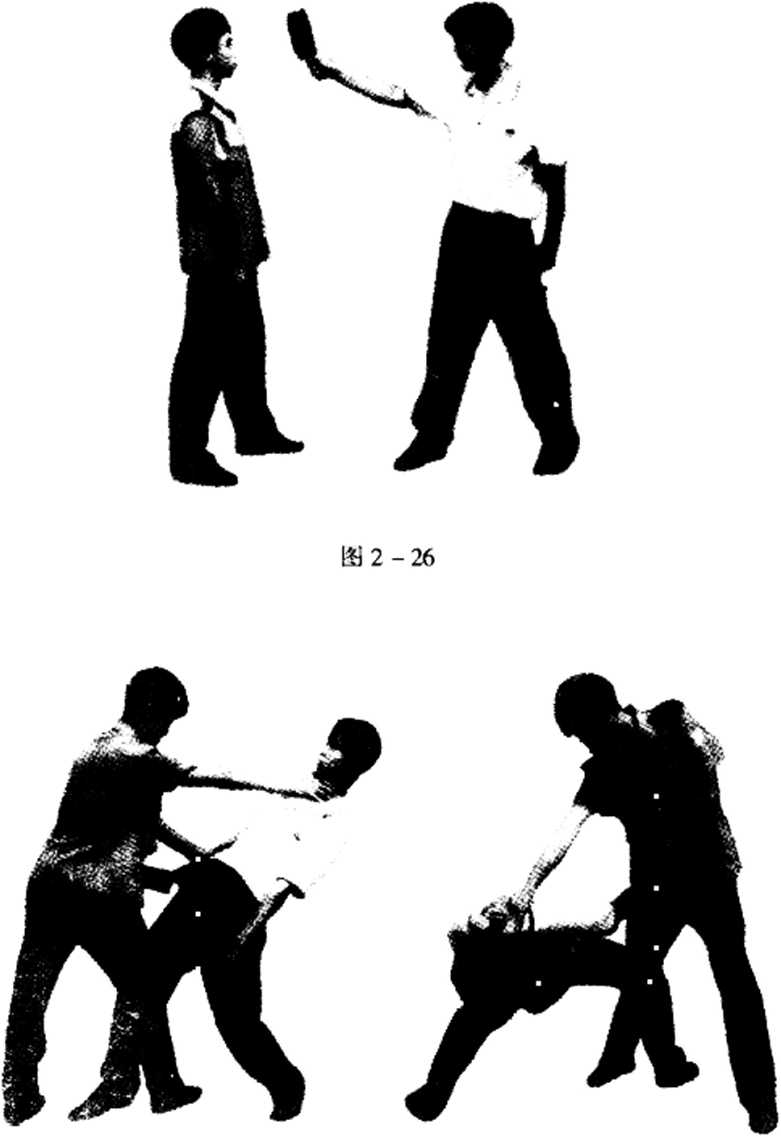 动作对方右手持菜刀由上向下向我头部劈砍时我立即用左臂向上格架回手抓住其右前臂(最好是抓右手腕)向外翻拧同时右脚向前上步紧紧贴住其右腿用脚跟后蹬右手张开虎口向前掐其咽喉以右脚后绊与右手掐喉合力将其摔倒拿住。(图2—26、27、28)