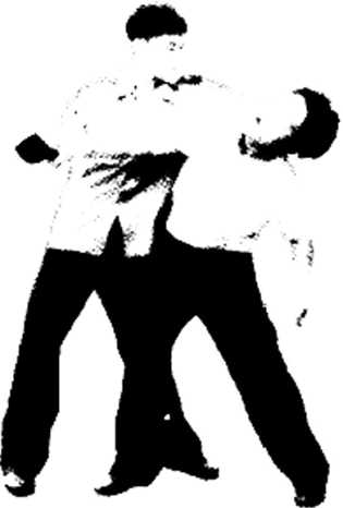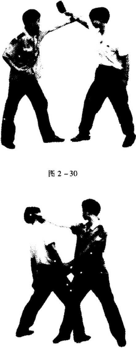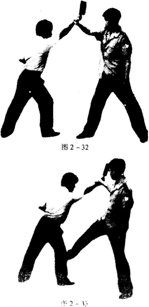 向后拉同时抬右脚踏击其右膝关节处屈左臂用左肘横扫其头面部使其膝部和头部受伤而失去抵抗能力。(图2—32、33、34)