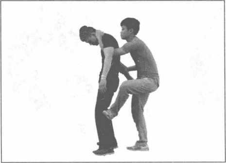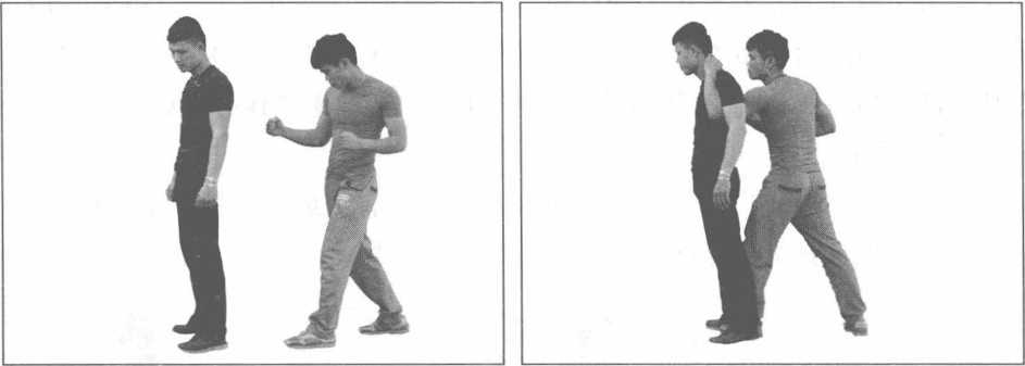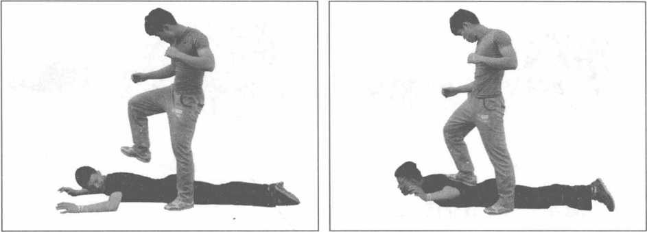 动作过程实战中我隐藏于对方背后时机成熟时左手突然从对方左侧腋下向前、向上插入穿绕腋下抓住对方脖颈的同时右手从后方抓住对方右手腕双手用力向上抬送对方的双臂后迅速抬起左腿自上而下猛踩对手左腿膝窝上下交错用力迫使对方摔倒成伏爬状态对手倒地瞬间我迅速上步跟进高高抬起右脚,继而用力向下踩踏对手后背脊椎予以进一步打击(图6-3-14?图6-3-19)