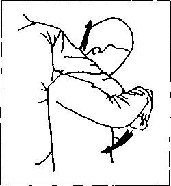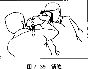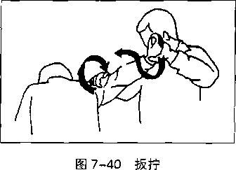 拿其上臂近腋窝处的软肉用力向其肩、颈部撕拧。两手动作一致如同操桨行舟一般周身合力对方肩关节被我锁定必然前俯直接造成擒拿(图7-40)。