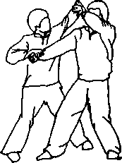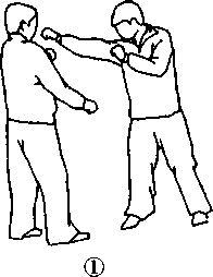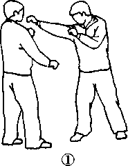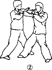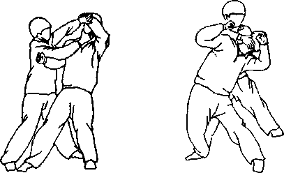 当对方伸右手或以右直拳击我时我疾进左脚用左前臂向内横格拦对方右臂疾翻左手掌沿对方右臂上横击向其左耳部。与此同时右手沿自己左臂上反手插向对方右耳部(由于对方右臂在我左臂下左手又忙于格挡我左手因而我右手可较顺利地触及对方头右部)四指扣抓其颈后部微抬肘前臂向其右下压旋其头。此时左手突翻掌向上托拿对方头部另一侧退左步两手合力向其左下方拧旋其头(图8-7)。必使对方翻身前跌且颈椎受损。如使用抖脆之力易使对方立即死亡。此技法为扳拧扳是扳拿对方头部拧是双手合力拧旋对方的头。
