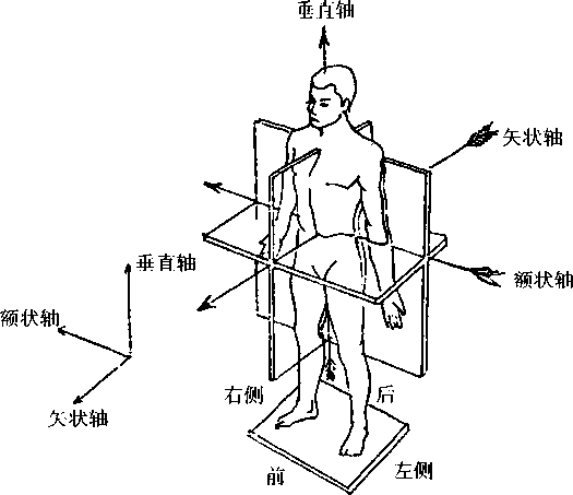 人体的运动是在三维空间中进行的研究人体的运动首先要建立三维坐标体系即建立三个线度相互垂直的空间坐标系对人体运动来讲就是矢状轴、额状轴、垂直轴(图1-10)。