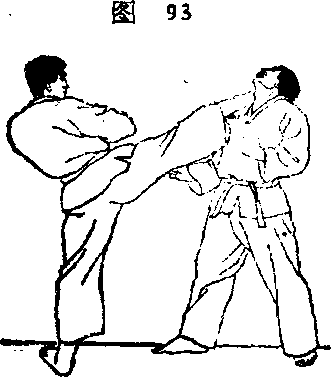 (4)装着,右腿突然屈膝,用脚掌鞭 打对手的面部(图98)。