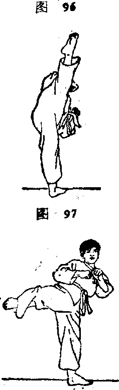 (3)上体侧倾;同时,右腿由屈到 伸,由外向里瓠形上摆(图97)0