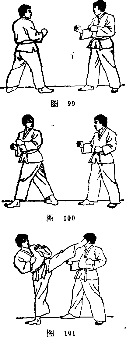 (1)面对目标,两脚前 后开立,右脚在前;两手握拳 做好准备姿势(图99)0(2)左脚外展,右脚内 扣;身体随之左转,背对目 标,眼视对手(图100)0(3)右腿支撑;左腿直 腿以歌关节为轴,向后上方 弧形摆踢,用足跟扫击对手 的面部(图101)。由于这种腿法幅度大,速度相对要慢些。为了获得更好的 击打效果,必须快速转身,加大转动惯量,以麟关节发力,直膝 后摆,从而增加摆腿的力度。