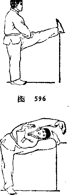 面对肋木或一定高度的物体, 并步站立,一腿放在肋木上,另一腿 直膝支撑;两手扶按膝关节,立腰收 髓;上体前屈并向前、向下做压振动 作(图596)。练习时,左右腿交替 进行O