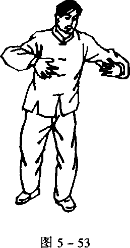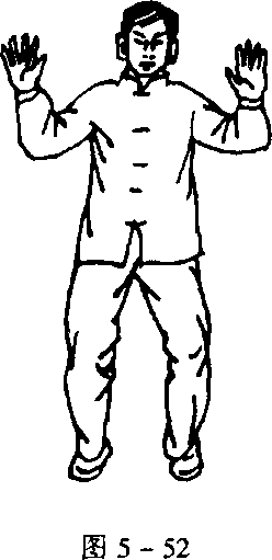 正步站桩,两臂轻轻抬起,十指分开,似夹非夹,腕略用
