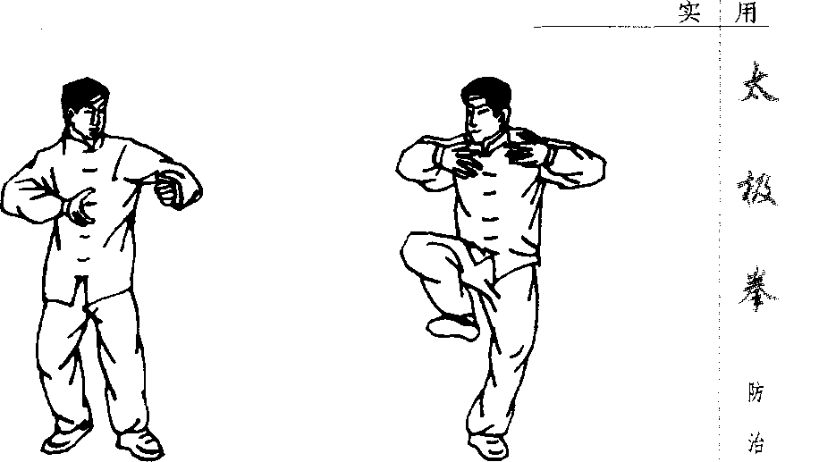 2. 正步站桩。精神集中,双臂抬起,手心向下,平放胸 :前,三分撑,七分抱,十指分开,似水中气球,虚灵挺拔,臀 :部似坐,右腿抬起,脚向外蹬,脚尖稍微回勾,右腿变曲,臀