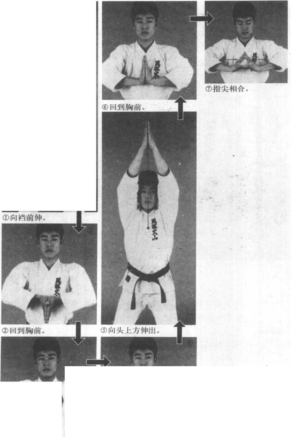 ? 运动方法——合掌,先向档前伸(图①),再回到原位(图②),接着指 尖向前,手向前方伸出(图③),再回到原位(图④)。指尖向上,手向头的上 方伸出(图⑤),再次回原位(图⑥)。最后指尖相合,用力,指关节绷紧后, 两手松开抖动。