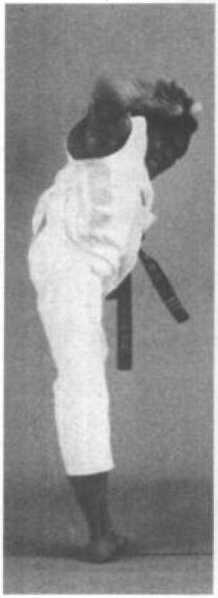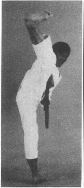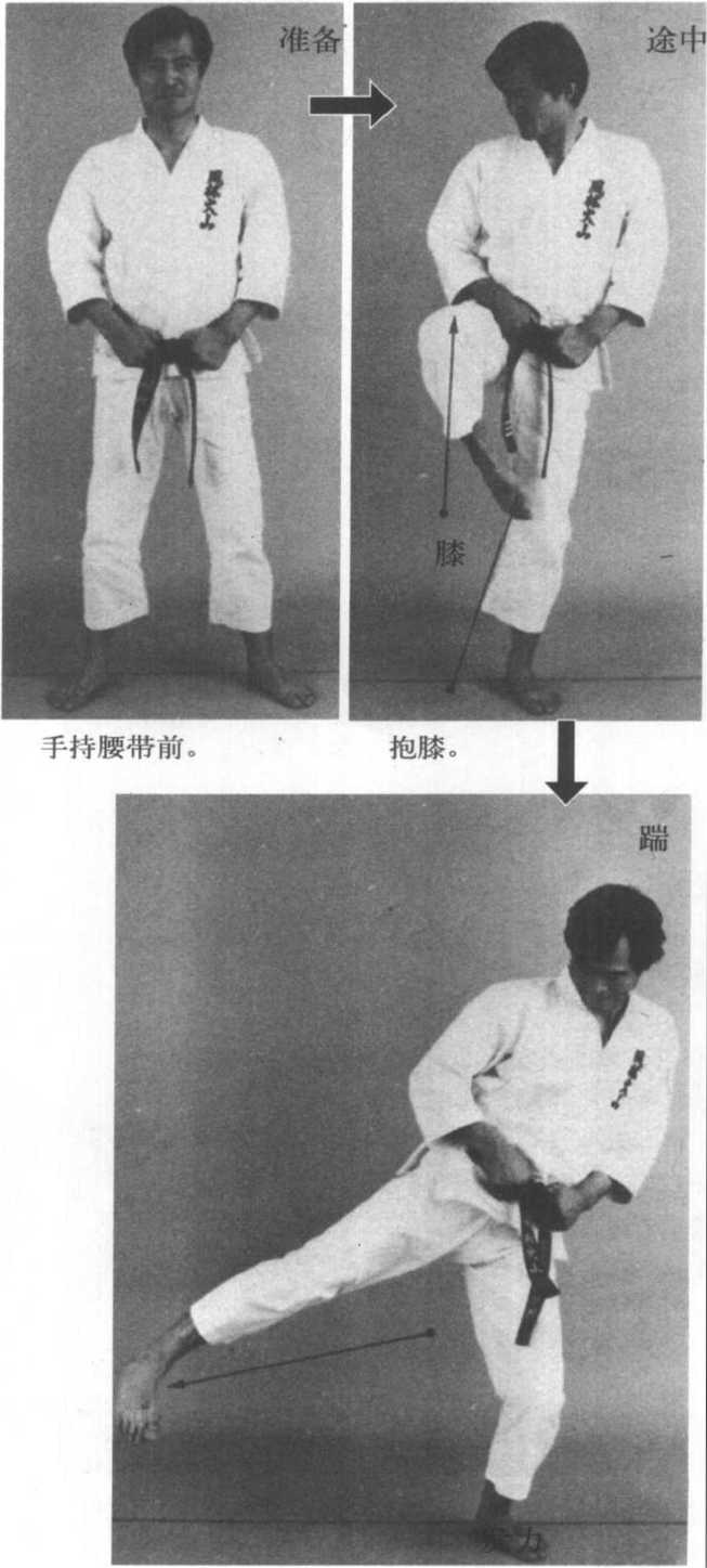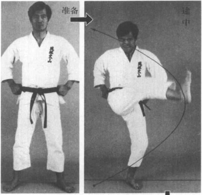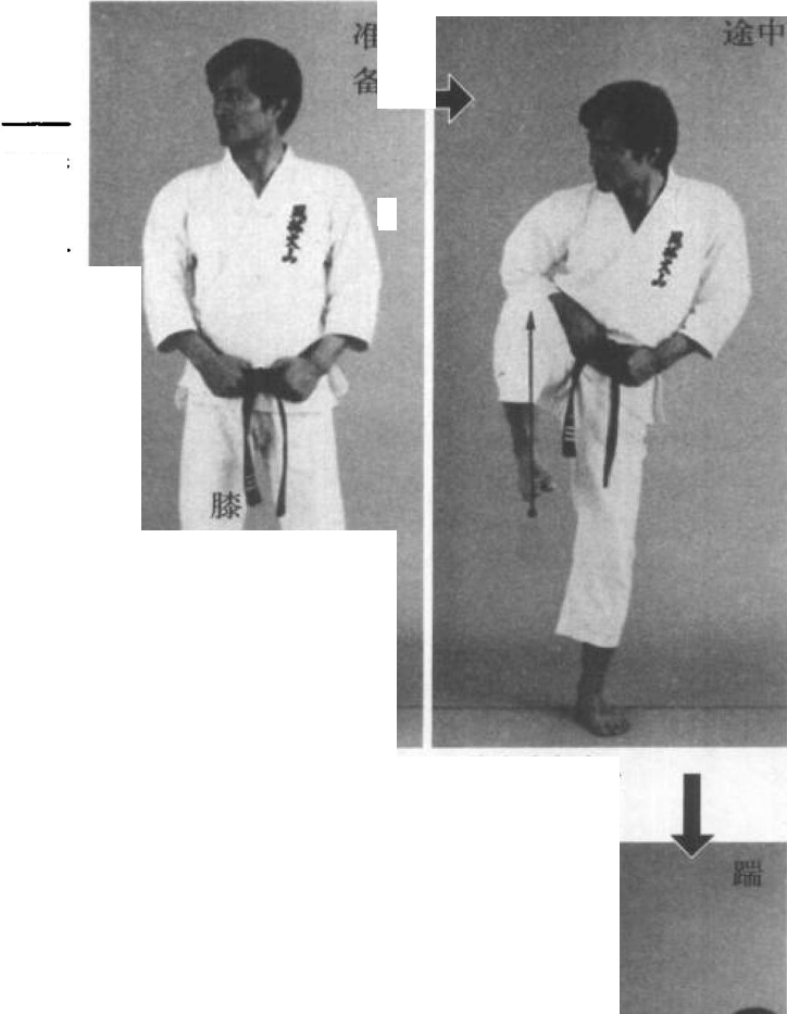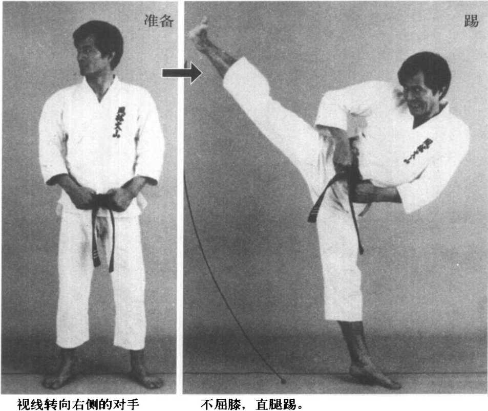 ?练习方法——脚转换成足刀,猛地对准右侧 对手的下颈踢去。收腿时,直接落下回到不动站立 位置。