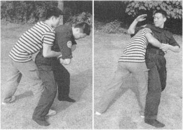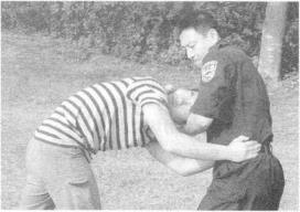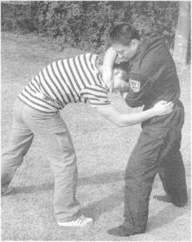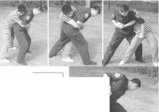 对方由前双手交叉环抱我腰部我双手卡住对方颈部右脚后撤将其头部下压在对方弯腰时迅速起右膝撞其裆部或腹部即可解脱。