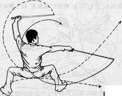 ①左斩剑:重心左移,体上升,左脚向左侧方上一步,屈膝 精实,右腿蹬直,体微前倾.与此同时,右手持剑微动,左手持 剑剑尖由左侧前向右.向上.向前,经面门前向左.向下顺时针 划弧做斩剑 势,持剑手 心向上,剑 尖与腰同高 ,位于左前 方,成屈膝 左斩剑、目 视左手剑尖 .(见图99)