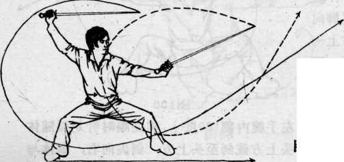碾地180度,左脚随右转体向右脚内侧方上一步,双脚踏实 成马步.与此同时,两手持剑同动.右手持剑手腕内翻,剑 尖在右侧前方顺时针划弧向头上方截剑,剑尖向左,剑体与 地面平行.左手剑尖向左.向左外、向下随左脚上步向左恻 下、向前.向上逆时针划弧撩剑掏腮而去,且位于左前方, 尖高柄低,持剑手心向上,成马步右上截左掏腮剑,目视左 侧剑尖.(见图102)
