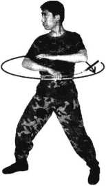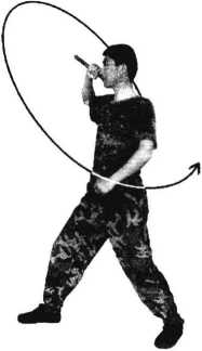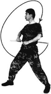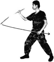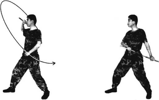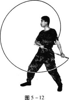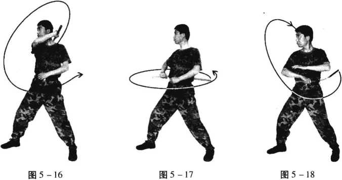 (4) 运棍右扫,棍向前、向右、向后运行,右腰卸力反弹(图5-15)。