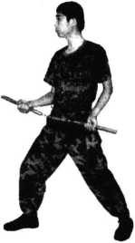 (1) 右脚在前,双手于左侧阳把持棍,成左拖棍姿势(图5-12)。