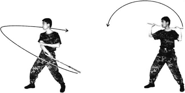 挎棍。左下劈,至左后自然回棍,右缠脖,左手 掌心在左肩向后卸力停棍,右手上抬,前劈,至右后 自然回棍,左缠脖,左手掌心在右肩向后卸力停棍,