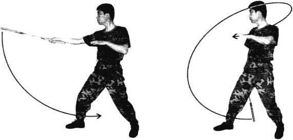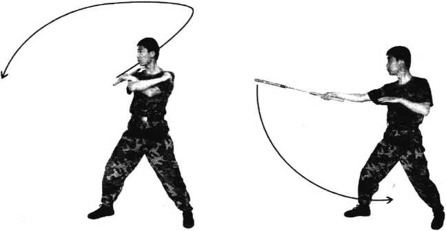 技法特色:这是一 个训练体后同把换手的 技法,分竖抡和横扫两 种情况。横扫时,攻击 性强,又具有迷惑性。