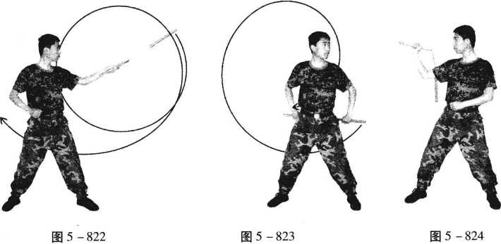 (8) 棍在左侧继续走立圆一周,上身右转成左右开立势,棍在身后继续 向下、向右运行至右后侧,右手在右腰侧阳把接棍,瞬间成后拉棍姿势 (图 5 -823)。