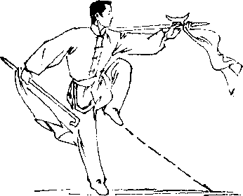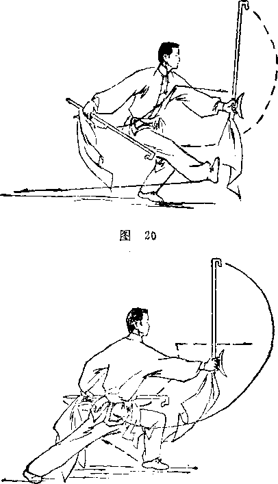 (1) 左腿不动,重心移至左腿,右腿屈膝提起,勾脚尖 外展45。向前下猛然踢出,力达脚跟,同时,右手钩向下拉 带于右胯旁。左手屈腕,钩向上立起后向前推出,力达月牙 刃,目视左手。(图20)(2) 右腿后落成左弓步,同时左手钩向下拉带于左胯旁, 右手屈肘立腕,使钩身立起,月牙刃向前推出,力达月牙 刃,目视右手。(图21)(3) 重心后移,右腿直立,左腿屈膝提起,同时,右手图21钩向后下拉带于右胯旁。左臂屈肘上提,使钩向上、向后划 弧,钩钻朝前,经右前臂上方向前刺出,力达钻尖,目视钻 尖。(图22)图22
