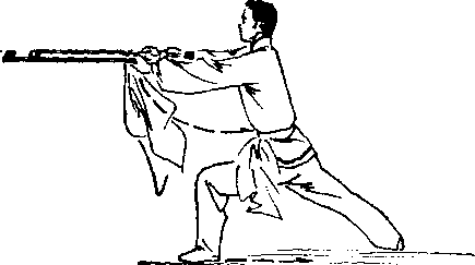 大步屈膝成左弓步,同时两臂外旋前伸,月牙刃正相对,两 钩平锁于体前,目视前方。(图75)