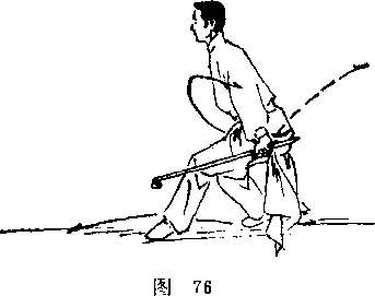 (2) 左脚后蹬,重心移至右腿,左腿屈膝回收,右腿屈 膝成左虚步,同时两臂内旋向后斜下抽按于腰侧,月牙护手 平朝外,目视前方。(图76)