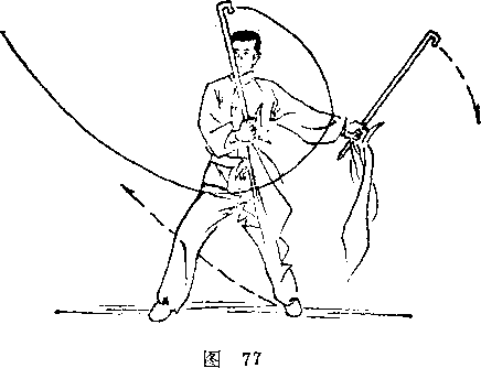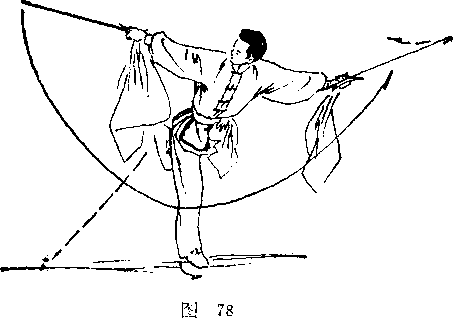内旋,使月牙刃平朝前,紧接右臂向右侧上摆,使钩经胸前 向右侧上,刃朝后划弧截钩,目视右钩。(图78)